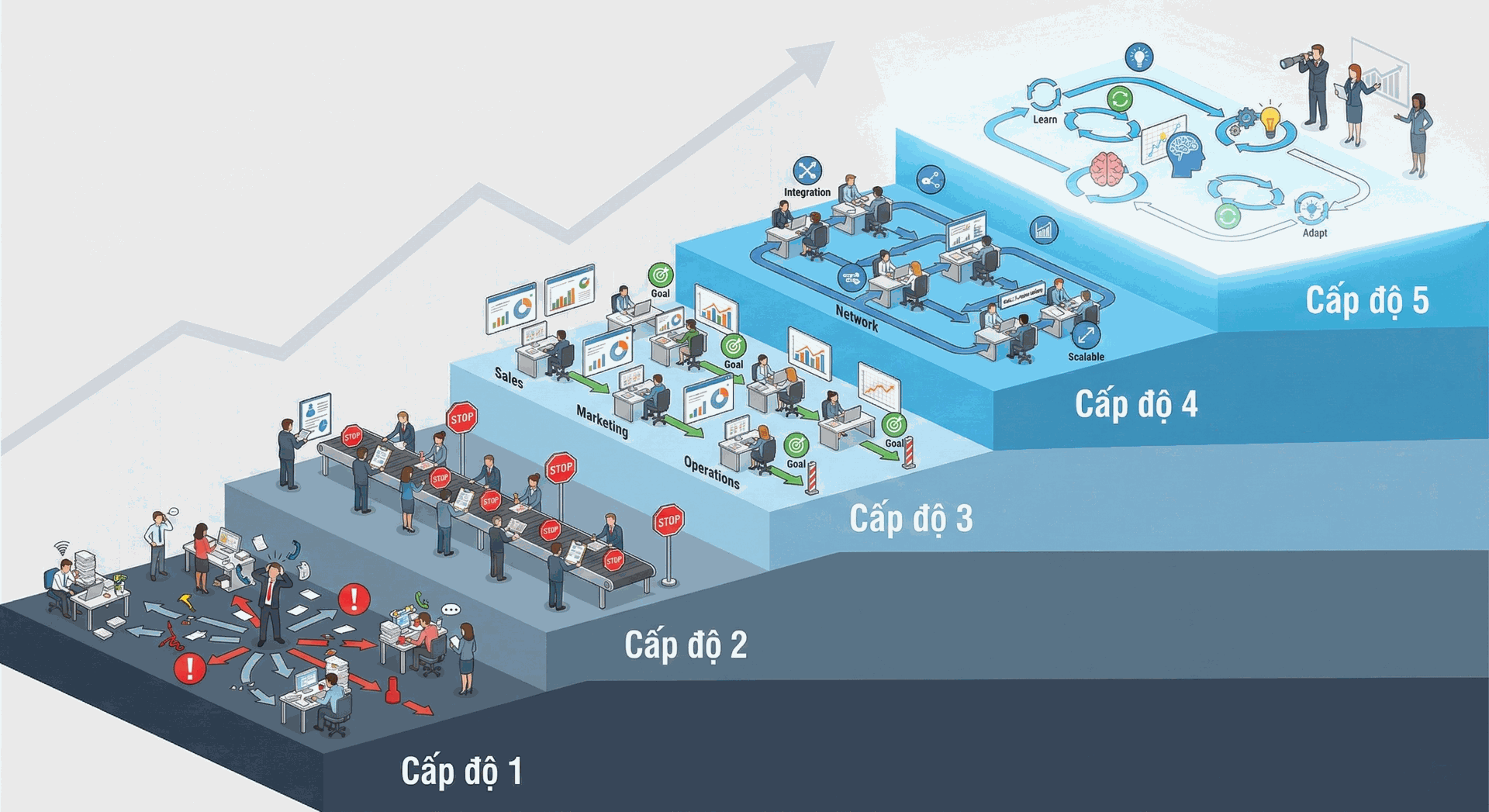 Vấn đề không phải họ làm sai, mà là doanh nghiệp đã bước sang cấp độ 3–4 trong khi hệ thống vẫn ở cấp độ 1–2. Giải pháp không nằm ở tuyển thêm người giỏi, mà ở việc tái thiết cấu trúc vận hành: làm rõ dòng giá trị, thiết kế lại cơ chế phối hợp, và chuyển vai trò lãnh đạo từ “người làm trung tâm” sang “người thiết kế hệ thống”.