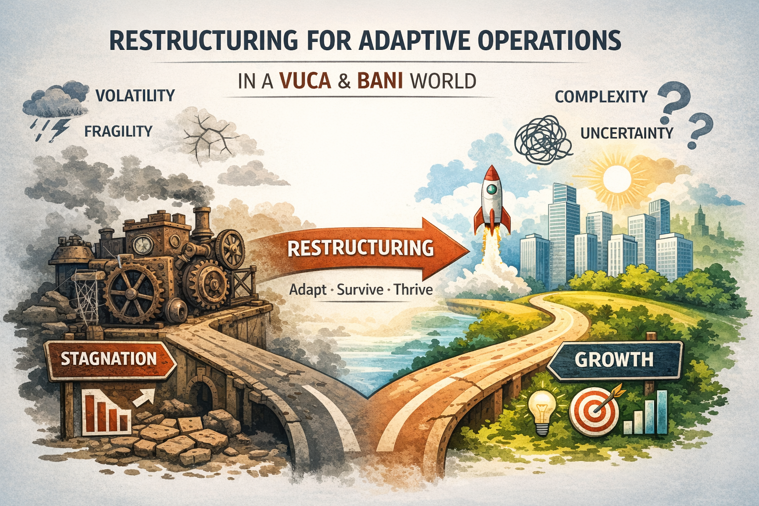 Trong bối cảnh VUCA và BANI, nơi môi trường kinh doanh biến động nhanh, mong manh và khó dự đoán, một cấu trúc vận hành từng hiệu quả có thể trở thành rào cản. Khi độ phức tạp của thị trường tăng nhanh hơn khả năng thích ứng của hệ thống nội bộ, tổ chức bắt đầu “vận hành để duy trì”, thay vì “vận hành để phát triển”. Ở thời điểm đó, tái cấu trúc không còn là lựa chọn mang tính cải tiến, mà là phản xạ cần thiết để tồn tại và trưởng thành.