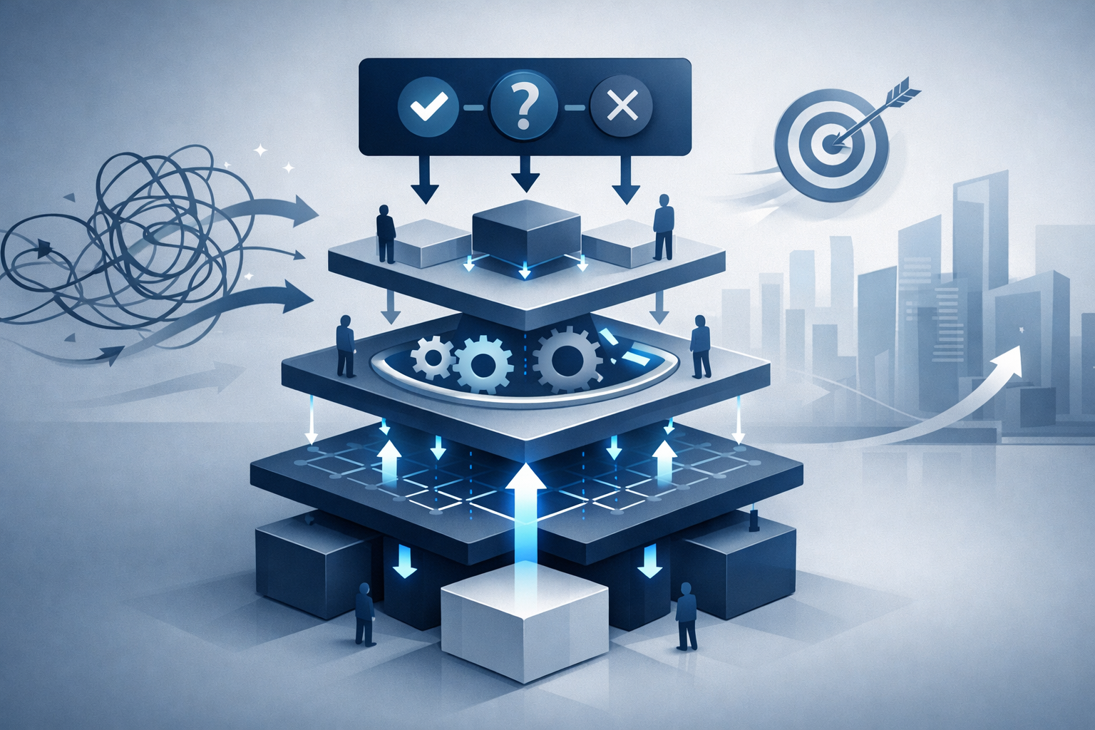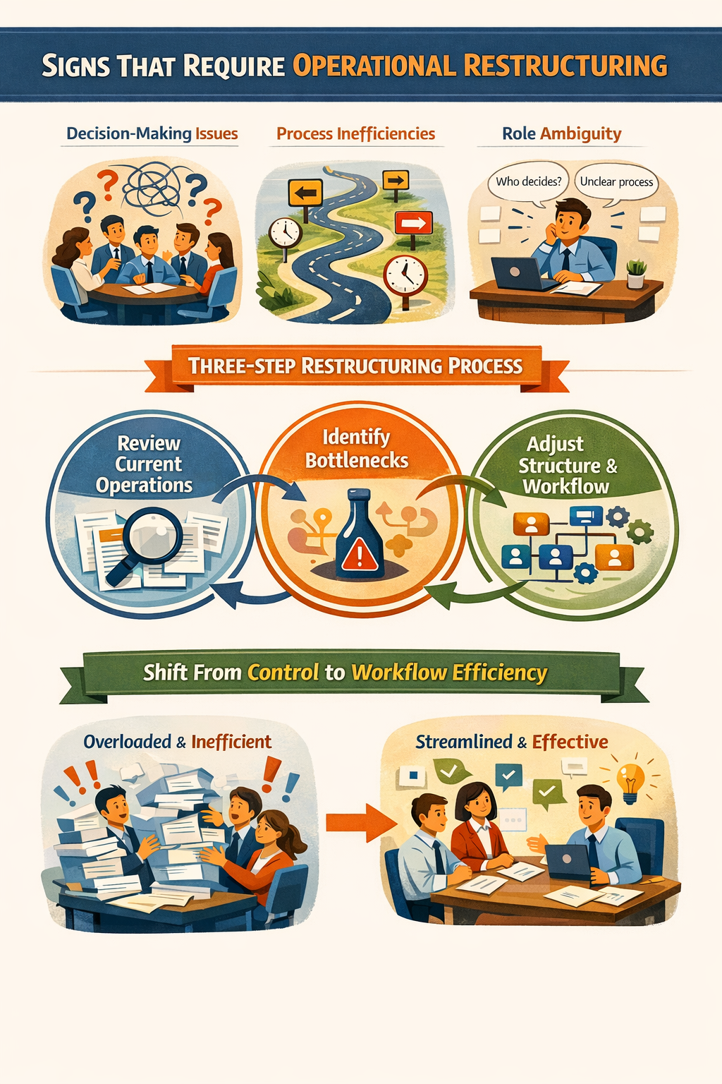 nhìn lại thực tế vận hành → xác định điểm nghẽn hệ thống → điều chỉnh cấu trúc ra quyết định và luồng công việc. Không bắt đầu từ sơ đồ tổ chức, mà bắt đầu từ cách công việc thực sự diễn ra mỗi ngày.