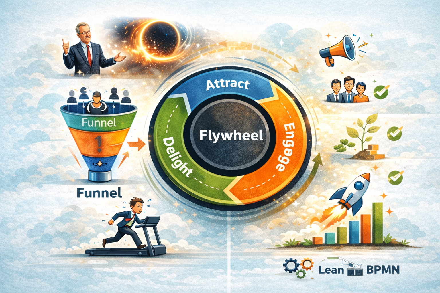 Flywheel cũng có điểm giao với tư duy Lean và BPMN: mọi bước trong hệ thống phải liên thông, giảm ma sát, và tạo giá trị cho bước kế tiếp.