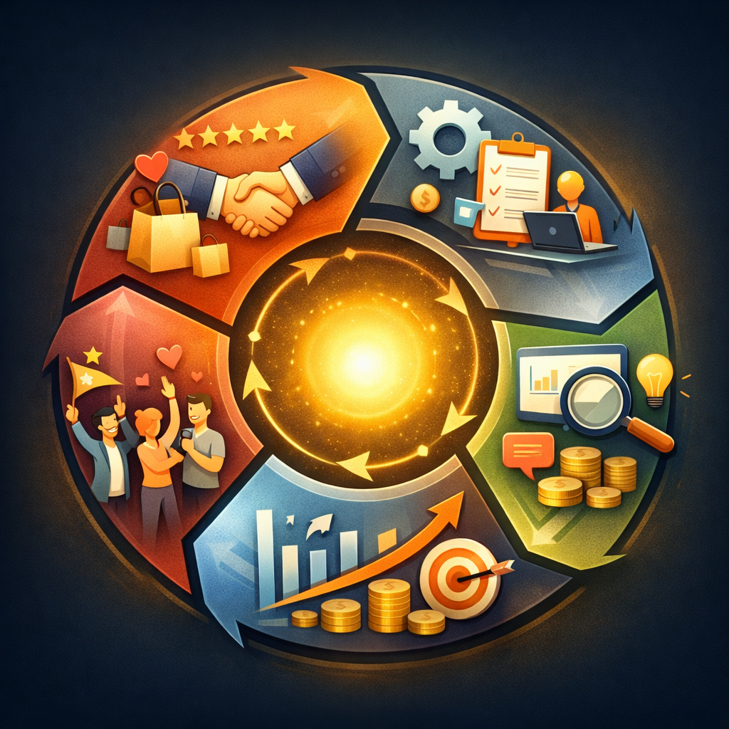 Một Flywheel chiến lược thường gồm 4–5 thành phần cốt lõi, tùy theo ngành và mô hình kinh doanh, nhưng có thể khái quát theo cấu trúc sau:
