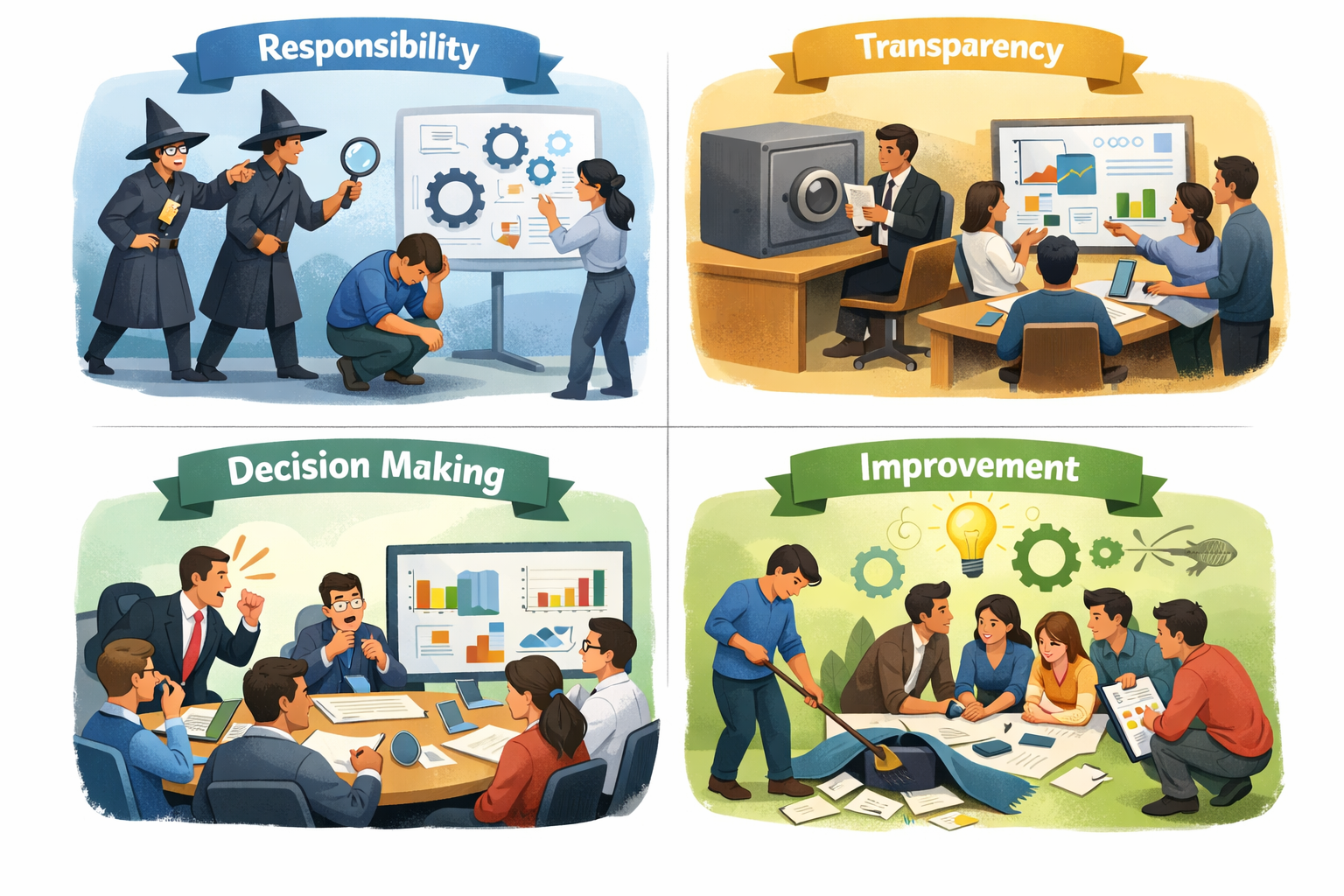 - Về Sự thật: Một tổ chức chỉ có thể trưởng thành khi cho phép nói thật. Những sự thật khó nghe cần được coi là liều thuốc quý để chữa bệnh, thay vì là lý do để trừng phạt.